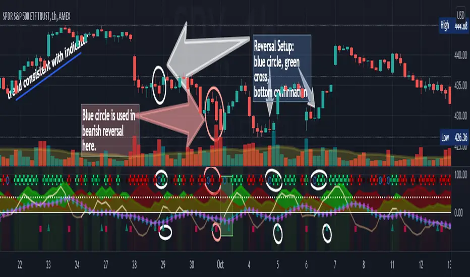 3) As shown on the chart, the Reversal setup usually consists of a blue circle, followed by a red or green cross, then confirmation from the bottom signal.