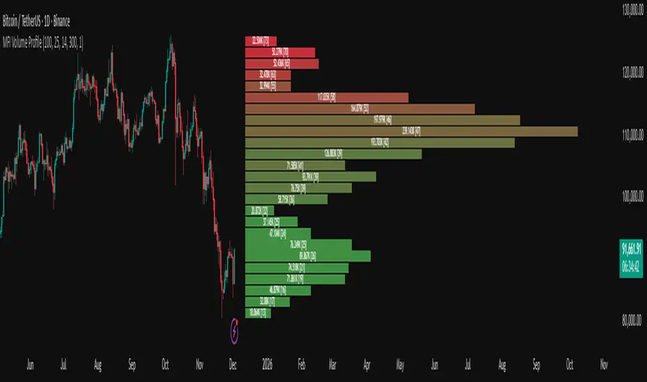 The script scans a user controlled lookback window and builds a set of price levels between the lowest and highest price in that period. For every bar inside that window, its volume is distributed across the price levels that the bar actually touched, and that volume is combined with the bar’s MFI value. This creates a volume weighted average MFI for each price level, so every row of the profile knows both how much volume traded there and what the typical money flow condition was when that volume appeared.