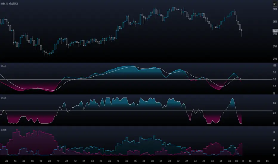 Usage is similar to RSI: DC Strength oscillates between 0 and 100. Low values (<20) indicate a bearish situation while high values (>80) indicate bullish ones. Center line (50) crossings can also indicate a possible trend change.
