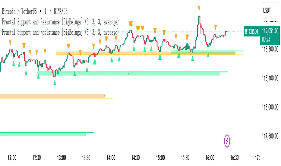 The Fractal Support and Resistance [BigBeluga] indicator automatically identifies high-probability support and resistance zones based on repeated fractal touches. When a defined number of fractal highs or lows cluster around the same price zone, the indicator plots a clean horizontal level and shaded zone, helping traders visualize structurally important areas where price may react.