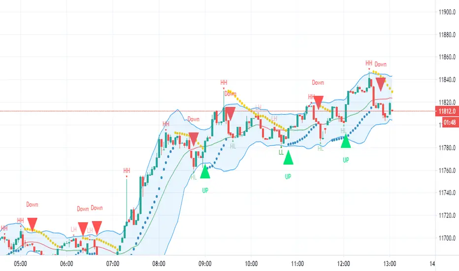 The Bollinger Bands have been added to enhance the possibility of a trend reversal occurring when the price reaches the Bollinger Band extremities and these should be paid attention to along with the Higher Highs (HH) and Lower Lows (LL).