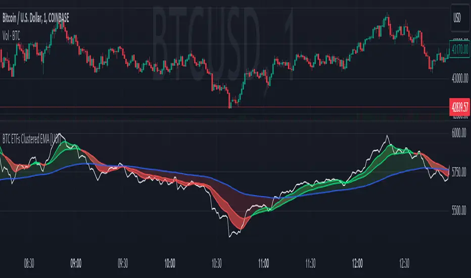 The 'Bitcoin ETFs Clustered EMA [UOI]' is designed to track and analyze the combined movement of various Bitcoin-related ETFs. This indicator incorporates a range of prominent ETFs, including iShares Bitcoin (IBIT), Bitwise Bitcoin (BITB), Tidal Bitcoin (DEFI), ARK Bitcoin (ARKB), Grayscale Bitcoin (GBTC), Fidelity Bitcoin (FBTC), WisdomTree Bitcoin (BTCW), Invesco Bitcoin (BTCO), Valkyrie Bitcoin (BRRR), VanEck Bitcoin (HODL), and Franklin Bitcoin (EZBC). By normalizing their prices to a unified scale and applying Exponential Moving Averages (EMAs) of different lengths (Short, Long, and Extra Long), it provides a comprehensive view of the aggregated trend strength and direction in the Bitcoin ETF market. Its color-coded plotting system offers quick visual cues for market sentiment, making it an invaluable tool for traders focusing on Bitcoin-related securities.