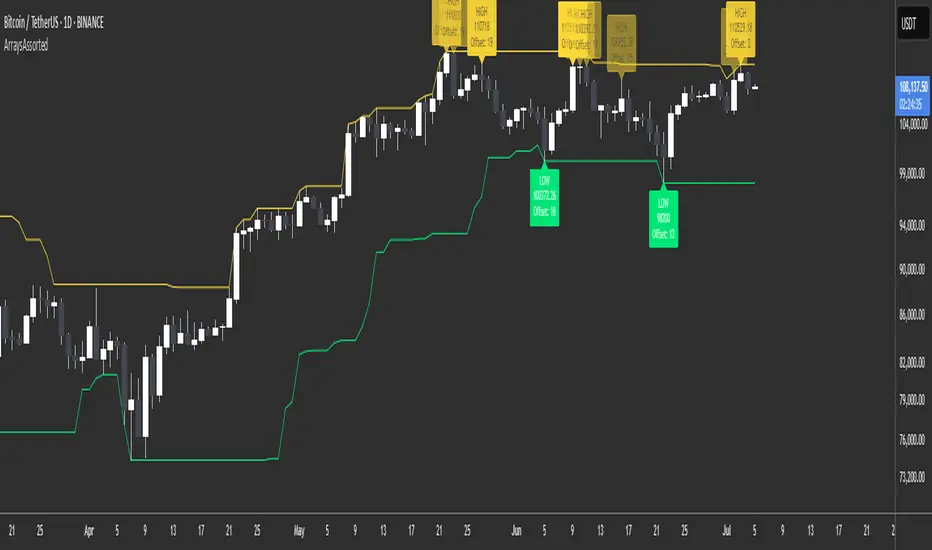 This library provides utility methods for working with arrays in Pine Script. The first method finds extreme values (highest/lowest) within a rolling lookback window and returns both the value and its position. I might extend the library for other ad-hoc methods I use to work with arrays.