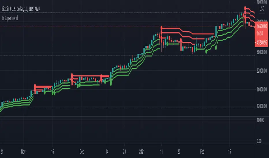 This triple supertrend indicator uses three different supertrend indicators with different and adjustable parameters. It is useful to filter false signals, set stop losses and detect sideways markets. When two or three (depending on the trading environment) supertrend lines turn green, a long is more suitable for a long position and vice versa.