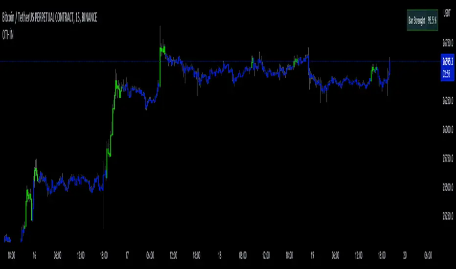 Her bir gösterge (RSI, Stokastik, WPR, MFI, CCI, ADX, RVI ve volatilite gibi) kendi başına farklı bir piyasa durumunu ölçüyor ve bu durumlar birleştirilerek genel bir 'bar gücü' değeri elde ediliyor. Bu değer, belirlenen eşik değerlere (Lower Threshold ve Upper Threshold) göre renklendirilerek piyasada bir yükseliş (yeşil) veya düşüş (kırmızı) durumu gösteriyor.