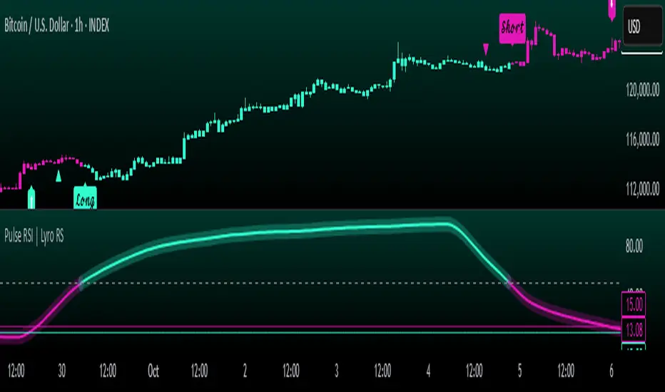 The Pulse RSI is a momentum oscillator that enhances the traditional RSI by incorporating volume-weighted price and linear regression. It generates multiple trading signals, including trend shifts, overbought/oversold conditions, and custom threshold levels.