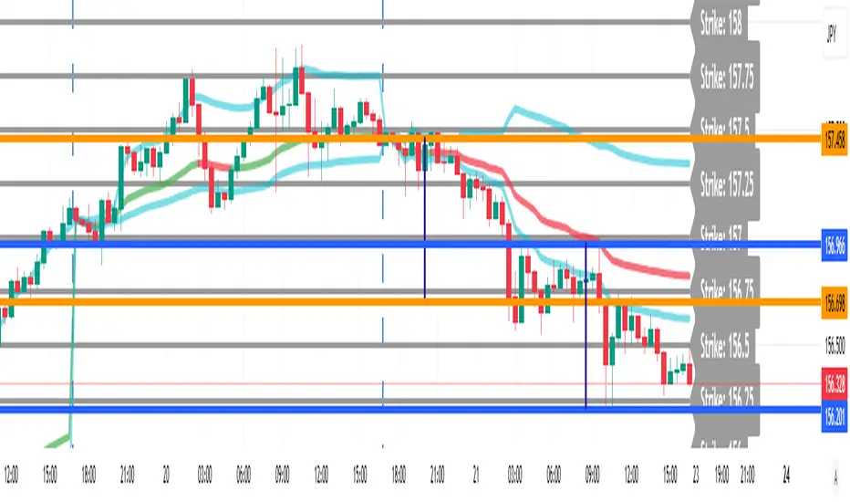 Multi-Asset Option Strike Prices automatically plots dynamic option strike levels for multiple assets on your chart. The indicator detects the active symbol and draws strike ladders above and below the current price using customizable strike increments (FX, indices, commodities, metals, etc.).