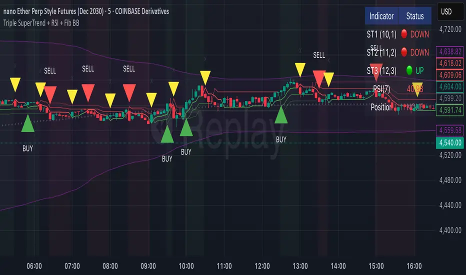 This advanced trading strategy combines the power of three SuperTrend indicators with RSI confirmation and Fibonacci Bollinger Bands to generate high-probability trade signals. The strategy is designed to capture strong trending moves while filtering out false signals through multi-indicator confluence.