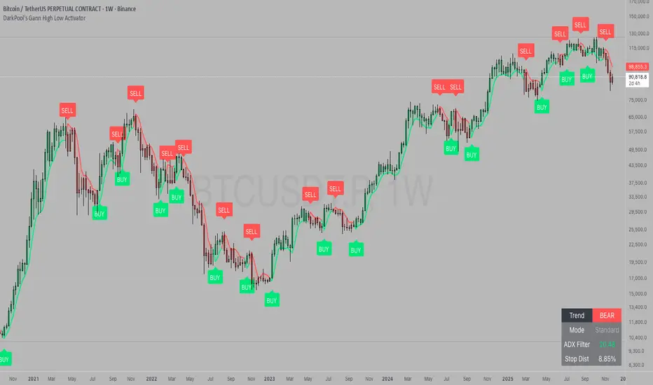 Heikin Ashi Smoothing: Standard price candles can produce erratic signals due to wicks and short-term volatility. This script includes a "Calculation Mode" setting that allows the Gann logic to run on Heikin Ashi average prices. This smoothes out price data, helping traders stay in trends longer by ignoring temporary pullbacks.