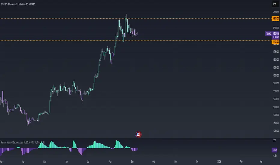 The Kalman Sigmoid Z-score indicator is a powerful tool for traders seeking to leverage advanced filtering and statistical analysis for momentum and trend-based opportunities. Its combination of Kalman-filtered price smoothing, sigmoid-weighted averaging, dynamic Z-score signals, and synchronized bar coloring offers a robust framework for informed trading decisions. As with all indicators, backtest thoroughly and integrate into a comprehensive trading strategy for optimal results. This indicator is provided for educational and informational purposes and should not be considered financial advice.