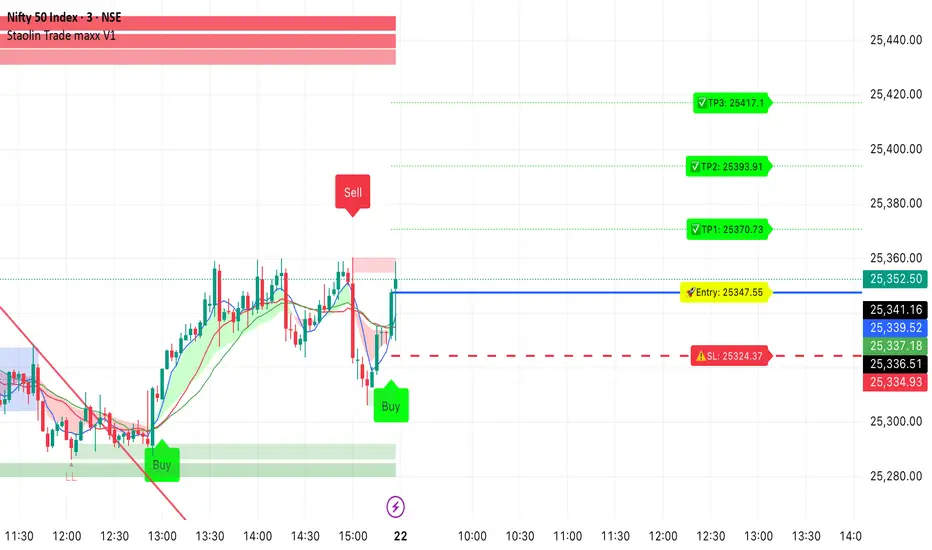 This script is a custom TradingView indicator named "Staolin Trade maxx V1". It overlays on price charts and includes features for visualizing support and resistance zones, trendlines, EMA-based trend fills, higher high/lower low labels, range boxes, Supertrend buy/sell signals, risk management lines with SL/TP levels, and customizable moving averages. Inputs allow toggling elements like trendlines, EMA trends, labels, ranges, and levels, as well as adjusting lengths, colors, sensitivities, signal strengths, and risk-reward ratios. Zones appear as gradient-filled bands (red for upper, green for lower), trendlines as extending lines (teal up, red down), EMA fills as translucent ribbons (green up, red down), labels as triangles (green HH, red LL), ranges as colored boxes (blue unbroken, green/red broken), signals as labels (green buy, red sell), SL/TP as extending lines with emoji-labeled tags (blue entry, red SL, green TPs), and MAs as lines (blue 5, red 13, green 20).