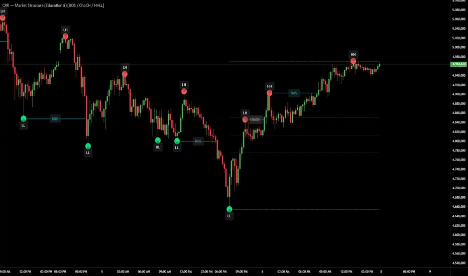 CRR — Market Structure (Educational) is an educational chart overlay designed to help traders visualize market structure and price behavior in a clear, objective way.