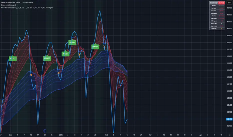 This indicator visualizes the Red White Blue (RWB) momentum system using 13 lines on your chart: 6 short-term EMAs (red), 6 long-term EMAs (blue), and a dotted close line.