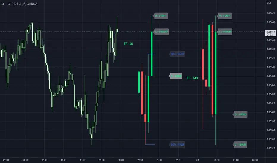 MTF対応となっておりチャートの右側に任意タイムフレームのローソク5本を最大2セット表示できます。