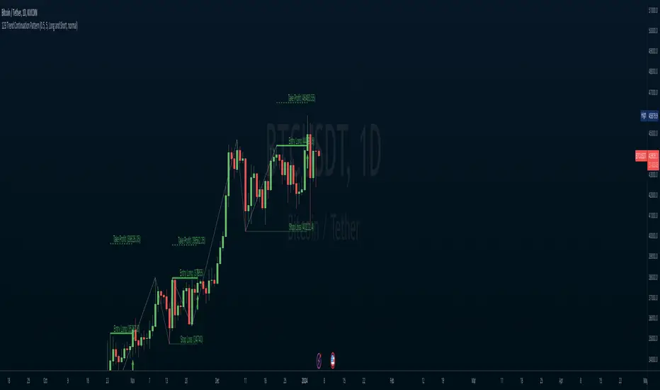 This simple indicator will help identify the 123 Patterns on the charts. It's build based on the zigzag indicator, which will work as a guideline to identify the 3 points. As soon as the price crosses the third point, the indicator will draw 3 lines: entry, take profit, and stop loss. Those lines will work as a reference and may help with other indicators. This kind of analysis will work on any time frame and symbol, but those markets that have high volatility may have better result