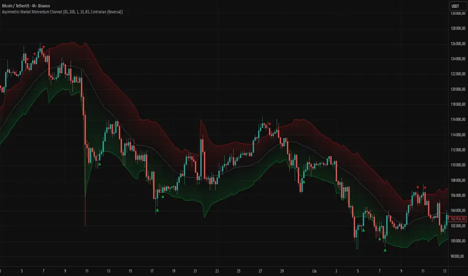 "Asymmetric Market Momentum Channel" is a dynamic channel indicator that adjusts its width based on the actual strength and asymmetry of market momentum. Thanks to the asymmetric band expansion triggered by strong candles, it significantly reduces false breakouts while remaining highly sensitive to genuine moves.