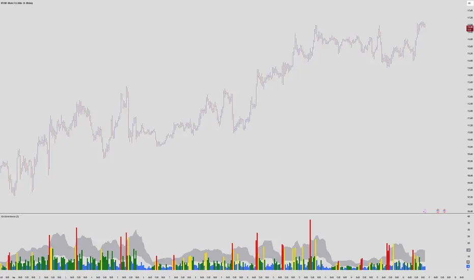 It calculates a moving average of volume over a user-defined smoothing window and uses that baseline to classify each bar’s volume into several intensity levels.