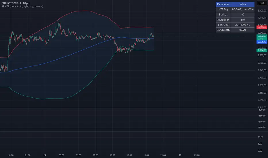 Known limits: Because the method approximates HTF behavior by scaling lookback, it is not identical to true HTF Bollinger Bands computed on aggregated candles. In particular, volatility and mean can differ slightly versus a real HTF series.