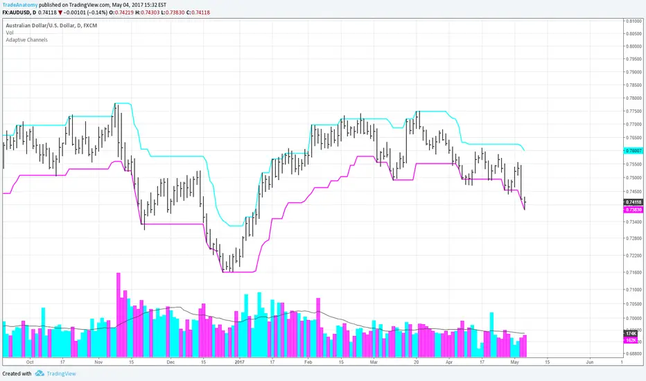 The Adaptive Channels provide an initial stop loss value when a new trade is executed either long or short. They can also be used to enter and exit the trade.