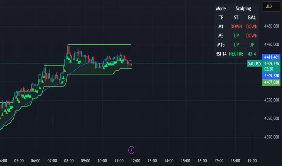 It combines an adaptive EMA based on trading mode, multi-timeframe SuperTrend, dynamic support and resistance levels, RSI, and a multi-TF dashboard for instant market clarity.