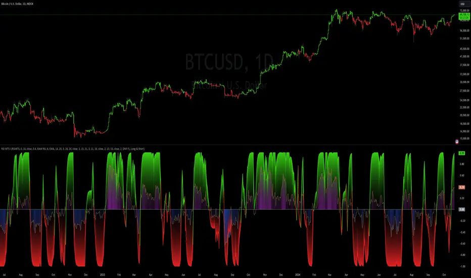 The RSI Weighted Trend System I is an experimental indicator designed to combine both slow-moving trend indicators for stable trend identification and fast-moving indicators to capture potential major turning points in the market. The novelty of this system lies in the dynamic weighting mechanism, where fast indicators receive weight based on the current Relative Strength Index (RSI) value, thus providing a flexible tool for traders seeking to adapt their strategies to varying market conditions.