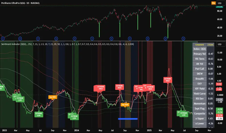 A comprehensive sentiment indicator that works across SPY, QQQ, SOXX, and custom symbols. Combines volatility, options flow, macro factors, technicals, and seasonality into a single z-score composite.