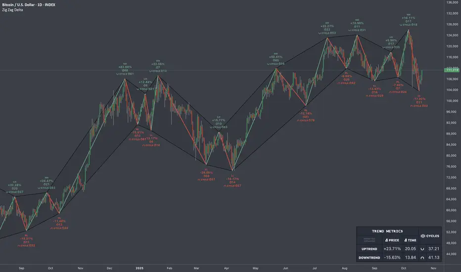“Zig Zag Trend Metrics” is a highly versatile indicator, built on the classic Zig Zag concept and thoughtfully designed for technical traders seeking a deeper, more structured view of market dynamics. This tool identifies significant swing highs and lows, classifies them, and annotates each with key metrics, offering a precise snapshot of each movement. It enhances visual analysis by drawing connecting lines that outline the flow of market structure, making trend progression and reversals instantly recognizable. Beyond visual mapping, it features a compact, real-time statistics table that calculates the average price and time deltas for both bullish and bearish swings, giving traders deep insights into trend momentum and rhythm. With extensive customization options, this indicator adapts seamlessly to vast trading styles or chart setups, empowering traders to spot patterns, evaluate trend strength, and make more confident, data-backed decisions.