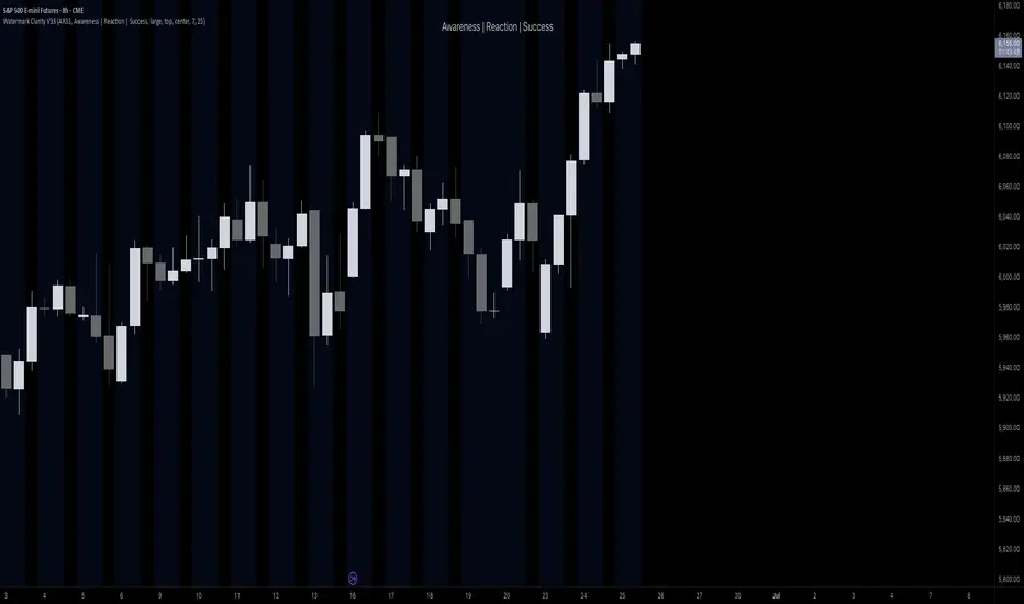 Watermark Clarity V33 is a visual utility tool designed to enhance chart awareness, focus, and clean aesthetics without adding market noise. Unlike traditional indicators, this script does not generate buy/sell signals or perform technical analysis. Instead, it provides a customizable on-chart watermark banner that clearly communicates your current mindset, risk awareness, or trading bias directly on the chart — helping traders stay aligned with their pre-defined plans and reducing impulsive behavior.