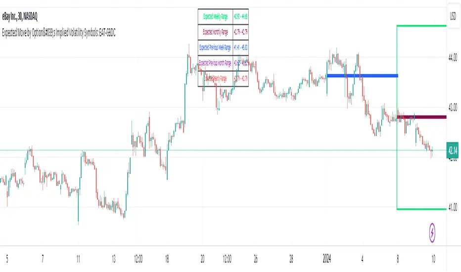This script plots boxes to reflect weekly, monthly and yearly expected moves based on "At The Money" put and call option's implied volatility.Symbols in range: This script will display Expected Move data for Symbols within the range of EAT-GDBC in alphabetical order.