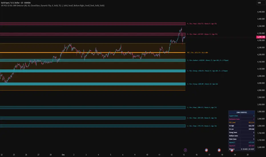 Visible Range POC & Volume SNR Detector PRO is a professional-grade volume-based market structure tool designed to identify institutional Support & Resistance zones, Point of Control (POC), and Value Areas directly from the visible chart range.