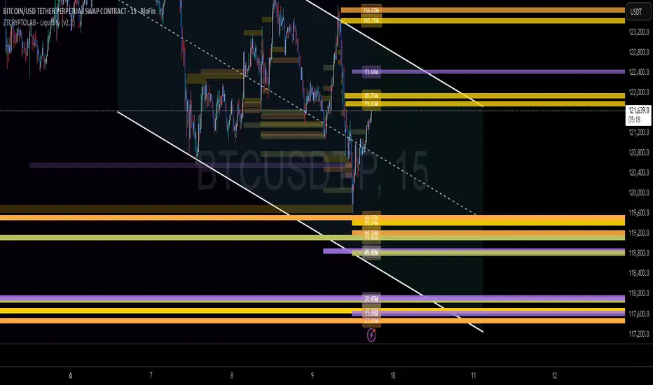 Finds likely liquidation zones above and below current price at three “tiers” (roughly like 25× / 50× / 100×).