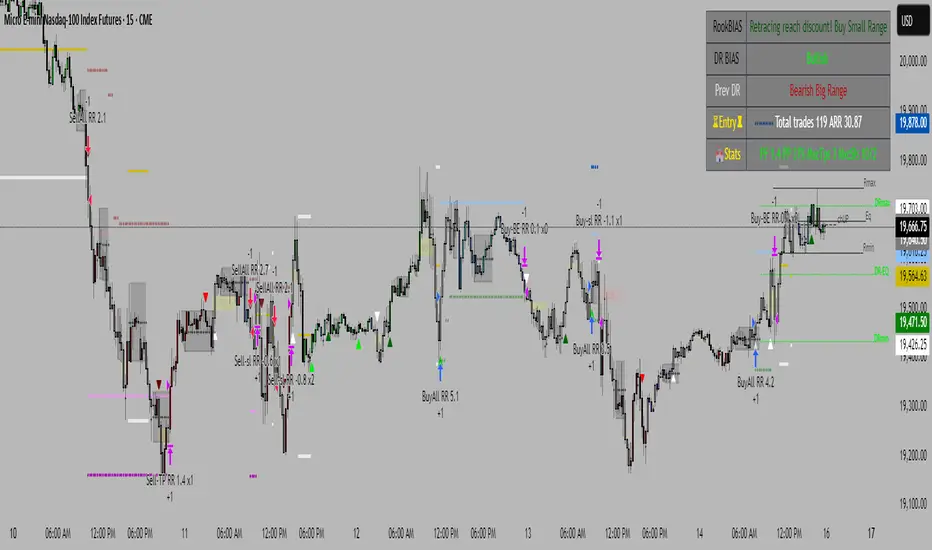 The Algo detects the current and previous market structure to identify current ranges and ICT dealing ranges that are created when the market takes buyside liquidity and sellside liquidity, it will tell if the market is in a consolidation, expansion, retracement or in a potential turtle soup environment, it will tell if the range is small or big compared to the previous one. Is important to use it in a trending markets because when is ranging the signals lose effectiveness.