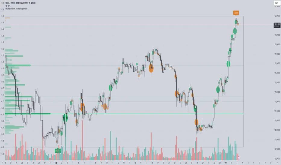This version of Liquidity Spectrum Visualizer (© BigBeluga) has been optimized to improve execution speed and reduce script load times without altering the visual output or analytical logic of the original indicator. The key improvements focus on reducing computational complexity, eliminating redundant calculations, and minimizing expensive function calls within loops.