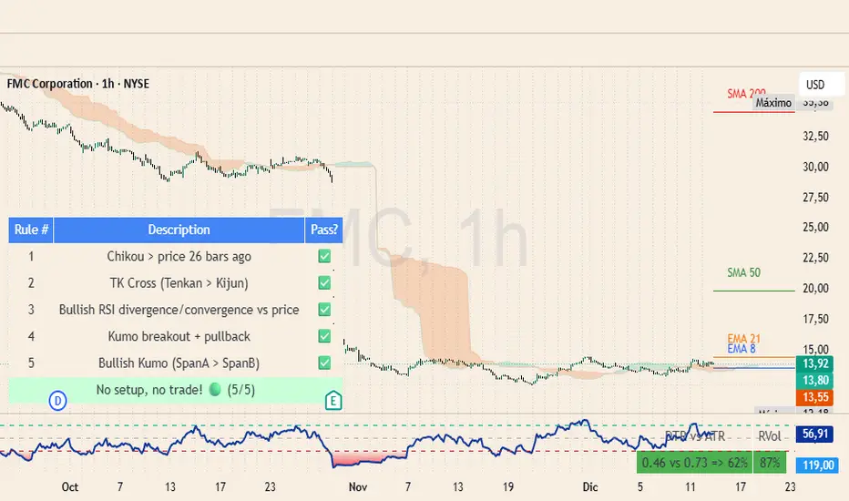This indicator implements a rule-based checklist built on Ichimoku Kinko Hyo, complemented with RSI and price structure, designed to help traders objectively evaluate whether a bullish setup is valid or not.