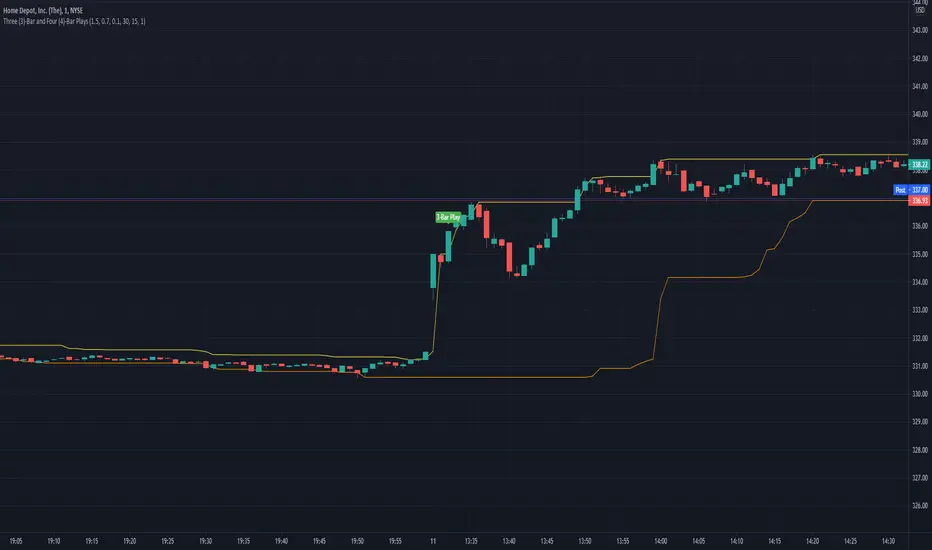 This indicator shows the three and four-bar play which is when price action has a wide igniting bar that has a full body, then one or two narrow bars which have a relatively equal high for long plays and relatively equal low for short plays, then a continuation bar. You should not take plays that will encounter resistance.