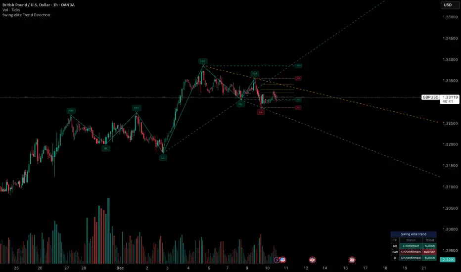 Swing elite Trend directionA comprehensive market structure indicator that identifies swing highs/lows, labels them with HH/HL/LH/LL structure, draws dynamic trendlines, and provides multi-timeframe trend analysis.