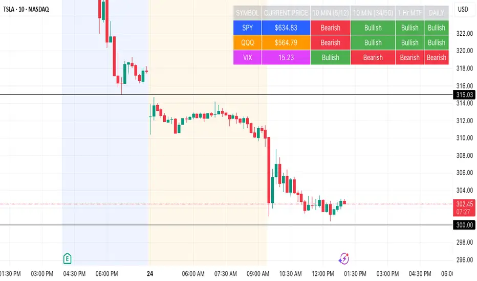 Based on Ripster EMA and 1 hour MTF Clouds, this custom TradingView indicator displays a visual trend status table for SPY, QQQ, and VIX using multiple timeframes and EMA-based logic to be used on any stock ticker.