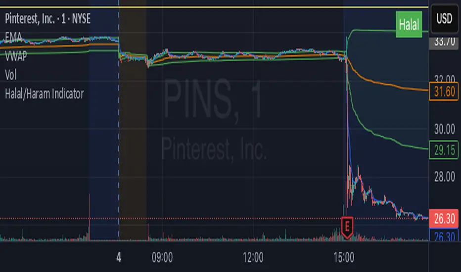 This indicator displays "halal" for stocks it knows are halal and "not sure" for others on top right corner of the chart
