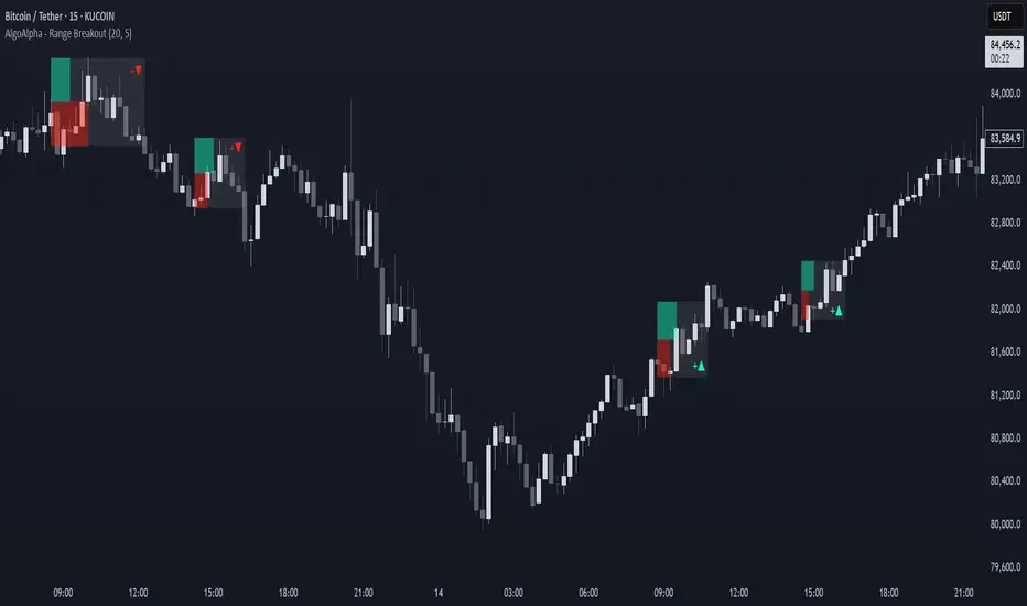 - Range Detection: Uses a volatility filter to identify low-volatility zones and marks them on the chart with shaded boxes.