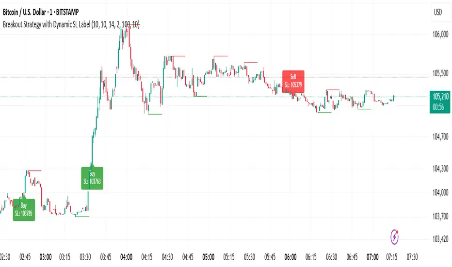 This script identifies breakout trading opportunities using adaptive support and resistance levels, adjusted dynamically based on market volatility. A trade signal is generated only when a breakout candle is followed by a confirming close in the same direction. The signal is displayed on the chart as a labeled marker that includes a suggested stop-loss level based on the highest high or lowest low of the past 10 bars, ensuring structure-aware risk management.
