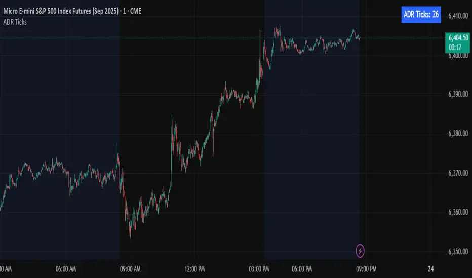 Purpose: The ADR Ticks Indicator calculates and displays the average daily price range of a financial instrument, expressed in ticks, over a user-specified number of days. It provides traders with a measure of average daily volatility, which can be used for position sizing, setting stop-loss/take-profit levels, or assessing market activity.