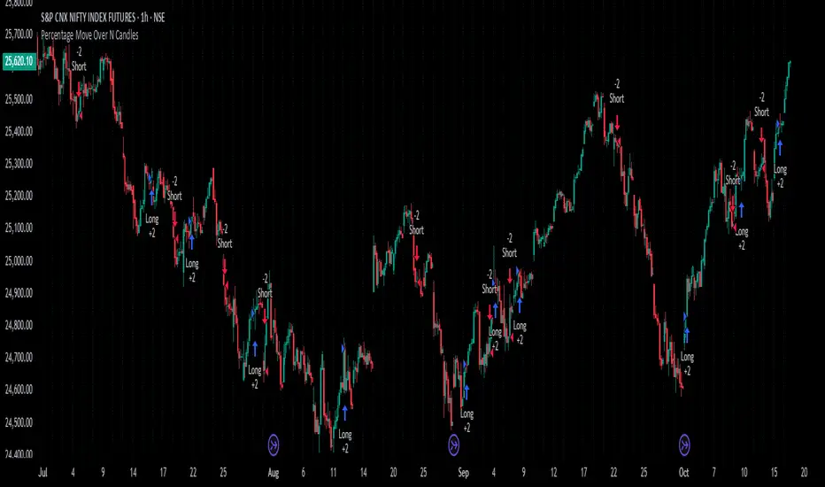 This strategy enters long/short trades if the price goes up/down by a certain defined percentage of the price, over a previous certain number of candles. Can be run on any time frame and on any instrument and alerts can be enabled.
