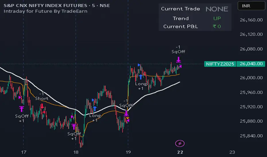 Visual Dashboard: An on-screen table displays the Current Trade Status (Long/Short), Trend Direction, and Running P&L in real-time.