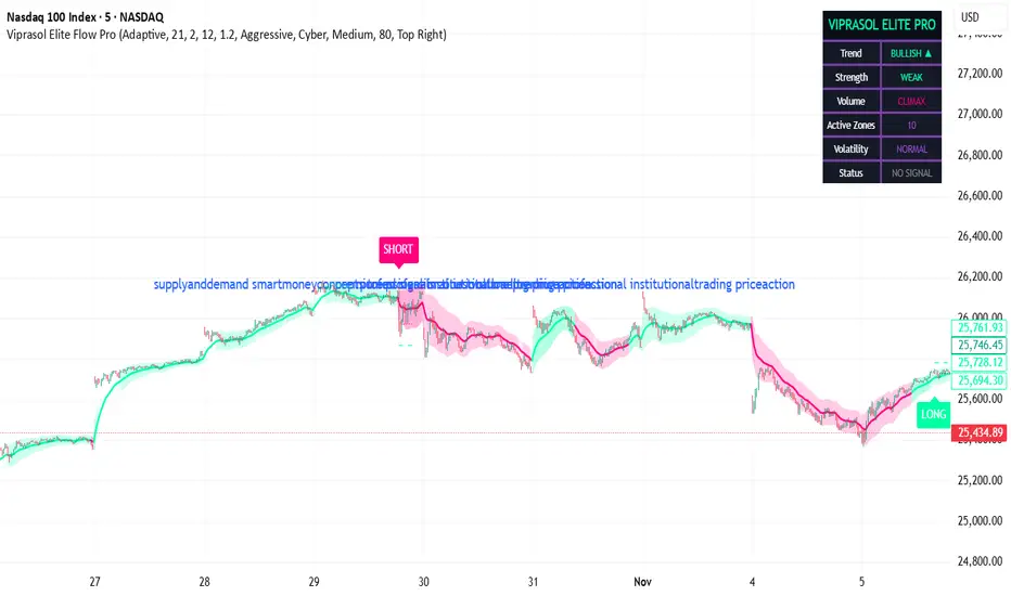 Viprasol Elite Flow Pro is a comprehensive trading system that combines institutional order flow analysis with adaptive trend detection. Unlike basic indicators, this tool identifies high-probability setups by analyzing where smart money is likely positioning, while filtering signals through multiple confirmation layers.