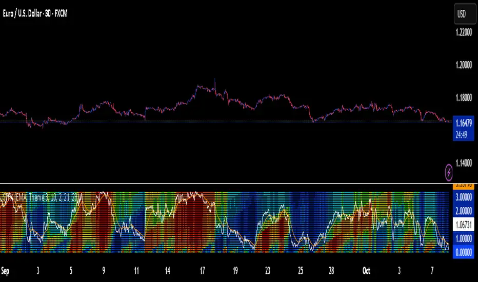 Bearish Signal (Sell): Fast crosses below Slow while the heat map is showing overbought colors (Green in Theme 1, Aqua in Theme 2, Red/Yellow in Theme 3).
