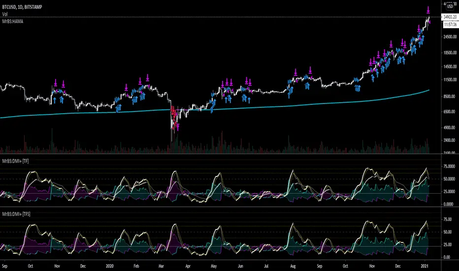 I made this to help me visualize my DMI+ strategy, when I was looking at taking signals from Heikin Ashi but looking at candlesticks. Turns out, I was going down the wrong road. Now I'm looking into using the real OHLC values for generating signals but watching the Heikin Ashi chart as I find it easier to see trends on it.