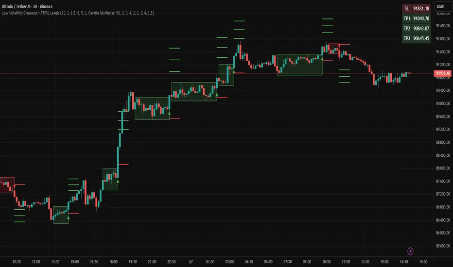 "Low Volatility Breakout + TP/SL Levels" is a breakout indicator designed to detect and trade breakouts from periods of low volatility (consolidation). Unlike classic strategies based on fixed support/resistance levels, this indicator dynamically identifies consolidations characterized by small candle bodies and only generates a signal when the breakout occurs with a large, decisive candle. It also automatically plots 3 Take Profit levels and a Stop Loss (with two calculation modes), making it a complete breakout trading tool.