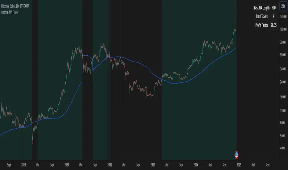 Once the optimal MA length is identified, the script overlays it on the chart, highlighting periods when the price crosses over or under the optimal MA, helping traders identify potential entry and exit points.