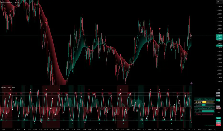 It combines Z-Score, Stochastic, Trend Filter, ADX/DI, and Volume to filter out high-quality trading signals.