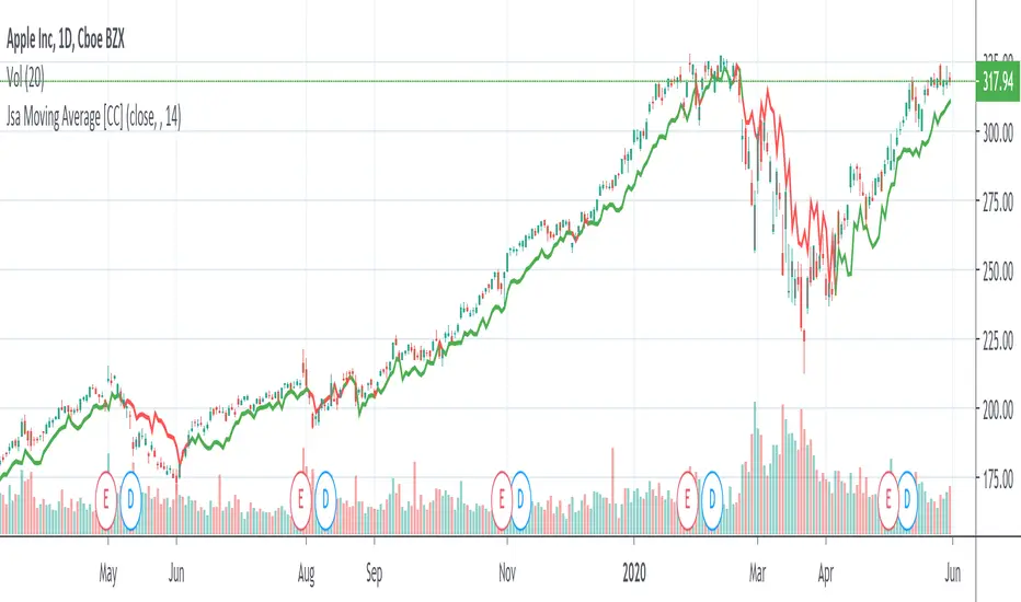 The Jsa Moving Average was created by George R. Arrington, Ph .D. (Stocks & Commodities V. 11:10 (427-431)) and it is an extremely simple formula but has very many great uses. For one thing it acts as support and resistance levels and it also acts like a trailing stop. It gives a wide enough berth during extended up or down trends to let you ride the wave up or down and when it gets close to the price it means that it is a choppy market. Buy when the indicator line is green and sell when it turns red.